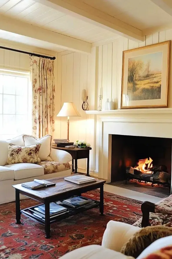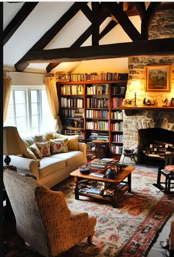 What I wanted was something different β the kind of space where muddy boots get kicked off by the door, the dog claims the couch as his own, and friends linger too long because itβs just that comfy. English cottage cozy. Old mismatched charm. Layers. Books. Life.