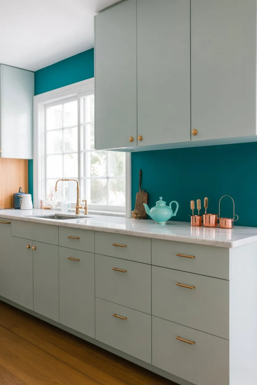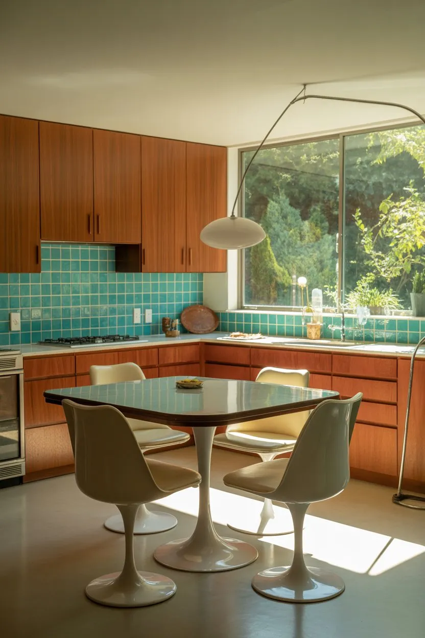 Nothing screams mid-century modern like rich, wood-tone cabinets. Walnut, teak, or warm oak sets the stage for the entire look.
