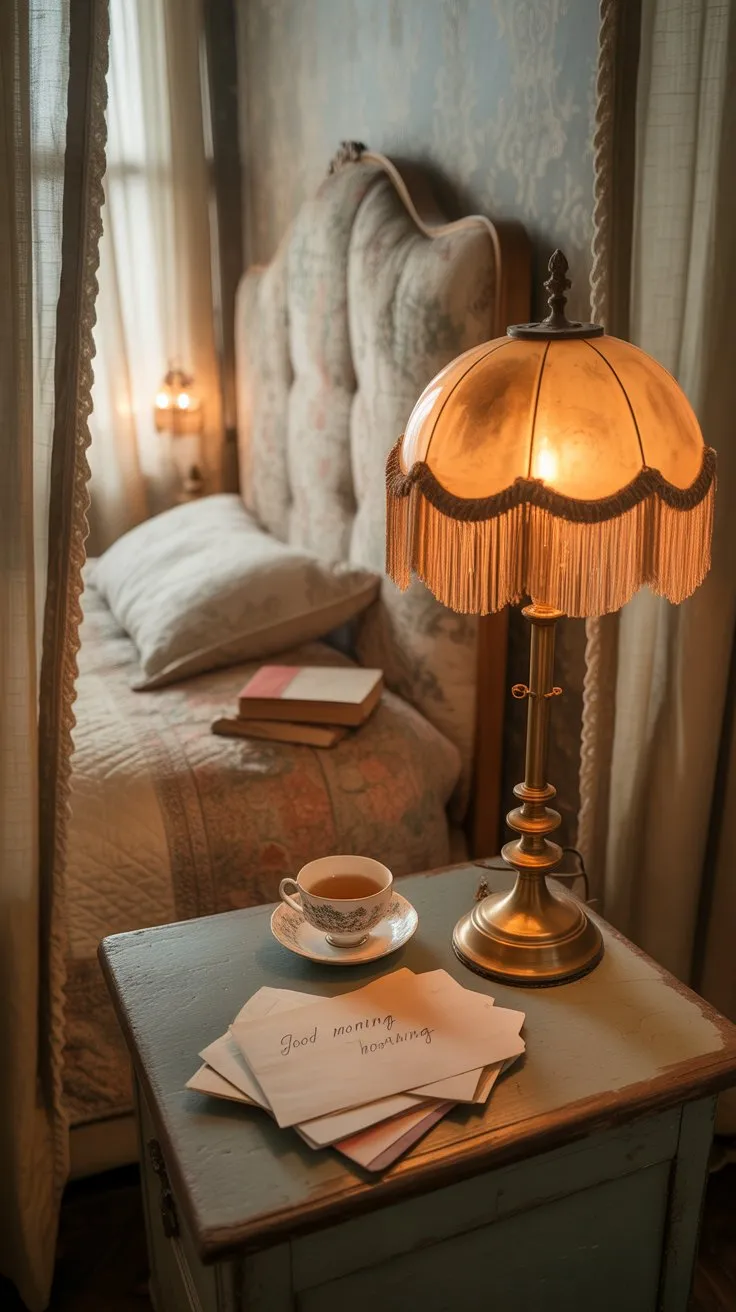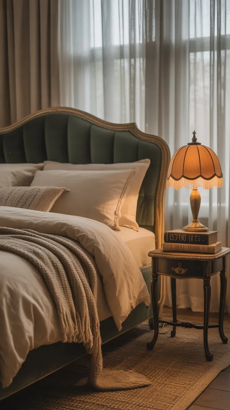 You don’t need a perfectly matched set of antique furniture. In fact, that’s the opposite of the vibe we’re going for. The charm is in the mix. A slightly battered nightstand from a flea market next to a modern lamp that feels vintage? Perfect.