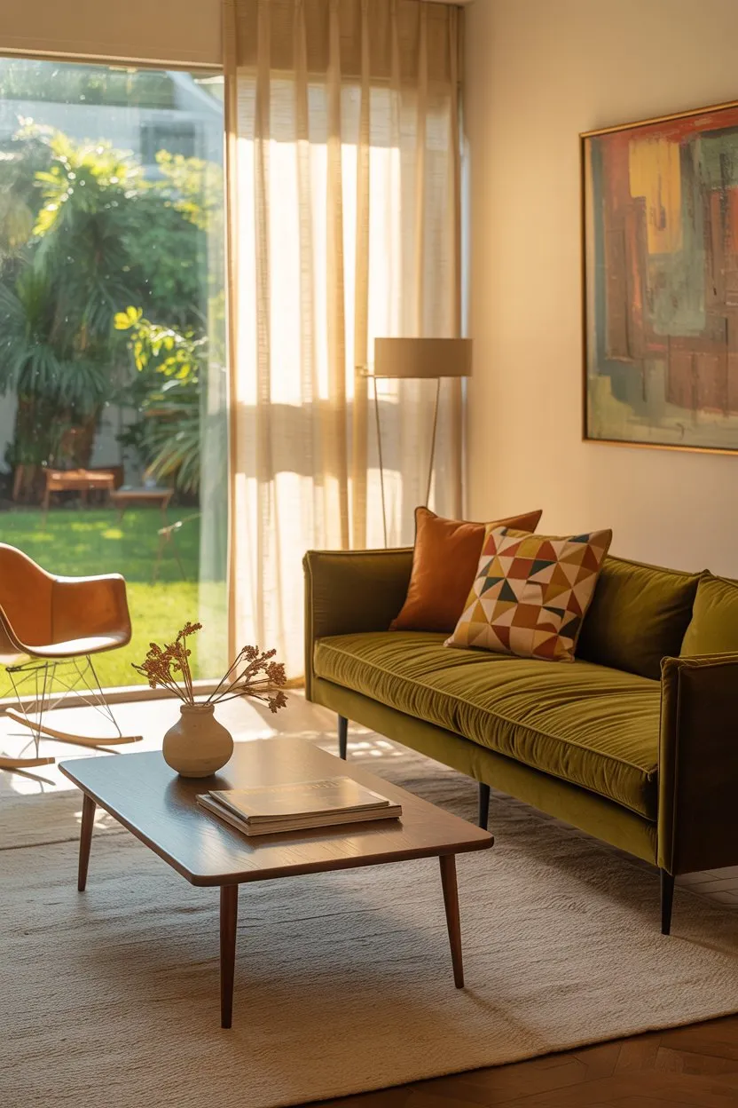 Mid-century modern design often uses a neutral color palette β whites, creams, soft grays β which allows bolder colors to stand out. Mustard yellow, burnt orange, deep teal, and olive green were all popular during the era and still work beautifully today.