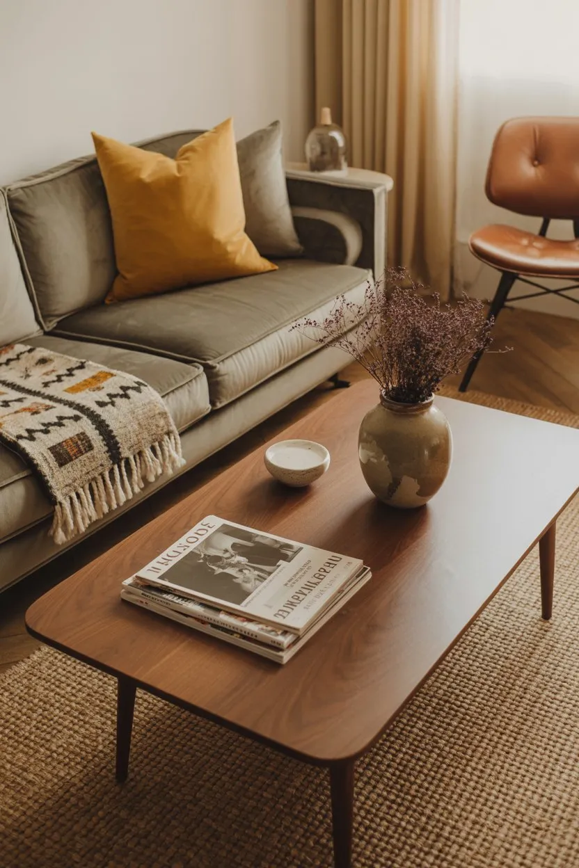 One of the easiest ways to bring that mid-century charm into your living room is through warm wood tones. Teak, walnut, oak β these materials instantly add depth and texture without feeling heavy.