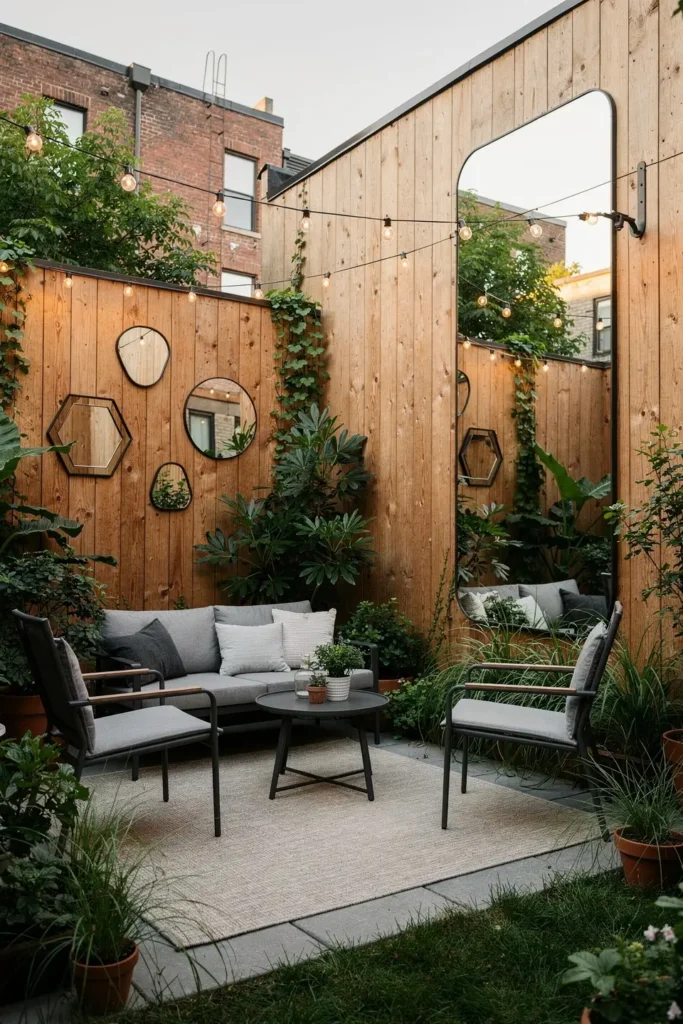 Yeah, I know it sounds kooky, but hang a mirror! Trust me, it’s not just for those “I need to check my hair before anyone sees me” moments. A strategically placed mirror can visually expand your space in miraculous ways. I found a vintage-style one at a flea market (total score) and propped it against the back fence.