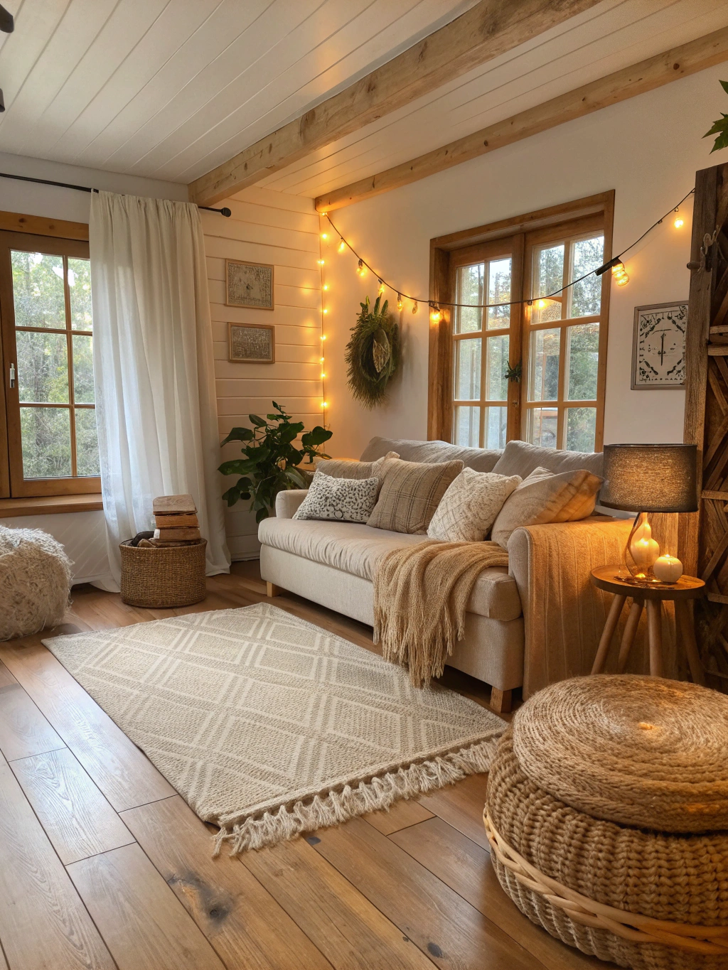 • String Lights: When the sun sets, strung lights around your living room add a magical touch. Pro tip: try to use warm-colored bulbs for that cozy glow.