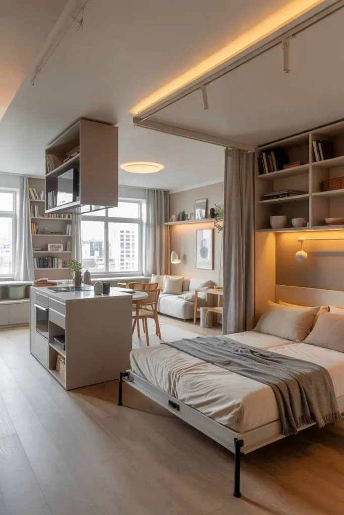 The number one rule for studio living? Define your spaces. Living, sleeping, working, and eating shouldn’t all blur together. Use area rugs, open shelving, or even lighting to create visual “zones.”